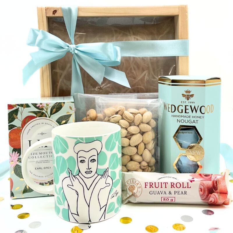 Our Gluten friendly hamper comes with a variety of nuts, tea, and cookies and a stunning CaRRoL BoYeS Mug.