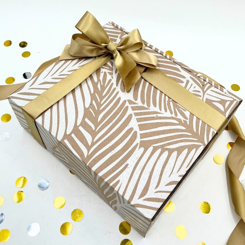This hamper is beautifully packed in our botanical leaves craft gift box and finished off with a satin ribbon.