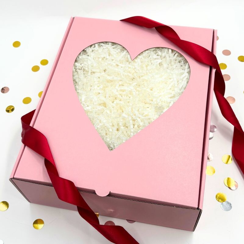 This hamper is beautifully wrapped in our pink heart gift box, finished off with satin ribbon and your personalized message card.