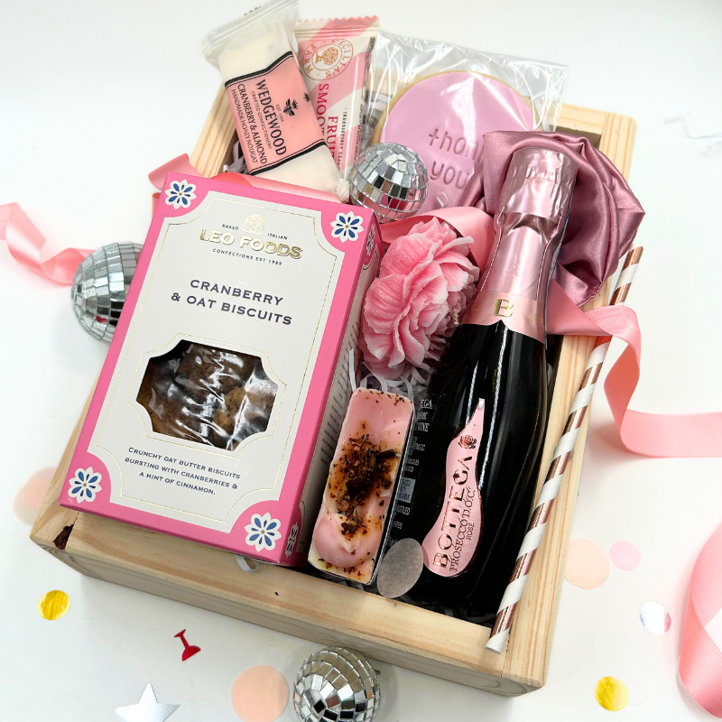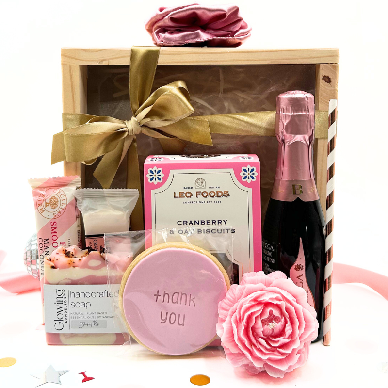 Our traditional wooden gift box includes a selection of gourmet goodies, handcrafted peony candle. artisan soap, dusty pink satin set with scrunchie and of course, bubbles to celebrate!